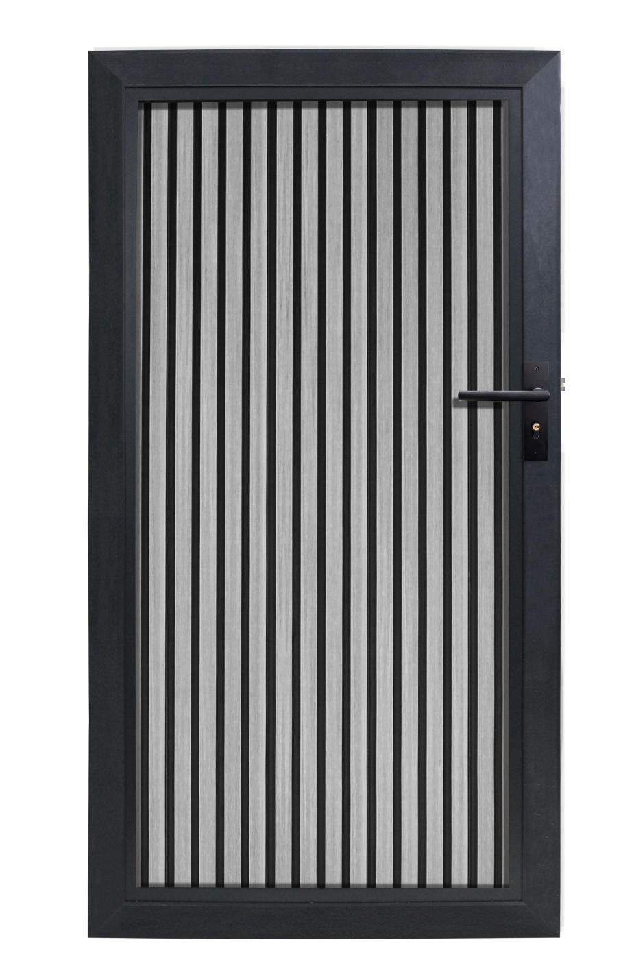 De Composiet tuindeur is de perfecte aanvulling op jou composiet Rhombus grijs Verticaal schutting. Deze Composiet tuindeur bestaat uit exact dezelfde Rhombus grijs planken als die van de schutting Verticaal grijs. Het aluminium frame maken we in de zelfde kleur als de Aluminium composiet schutting palen. De Verticaal grijs planken zijn voorzien van een zwarte achtergrond voor een modern diepte effect. Dit alles om te zorgen dat de tuindeur naadloos aansluit op jou composiet schutting.